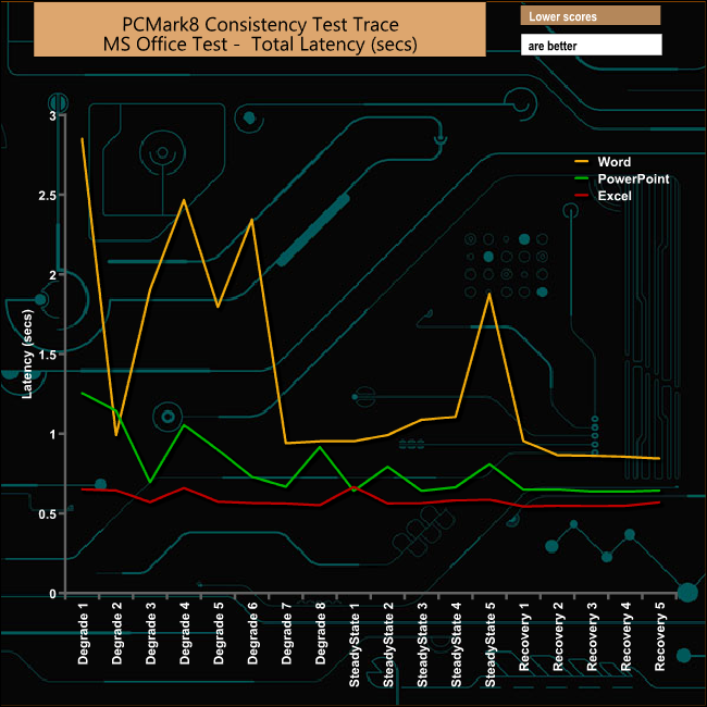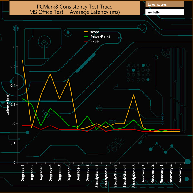 Both the MS Office and PowerPoint tests display significant drops in performance throughout the test phases, but more importantly the performance for both traces during the Recovery runs is first rate.