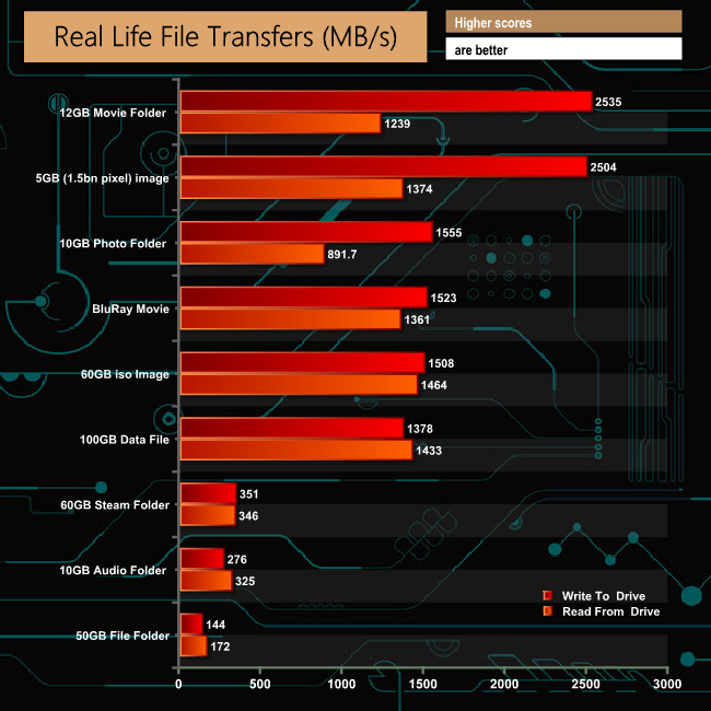 Although the drive had no problems with our suite of real life file transfer tests, it much prefers dealing with large files than small bity files as can be seen with the results for the 60GB Steam, 50GB File and 10GB Audio folders when compared against any of the other tests.
