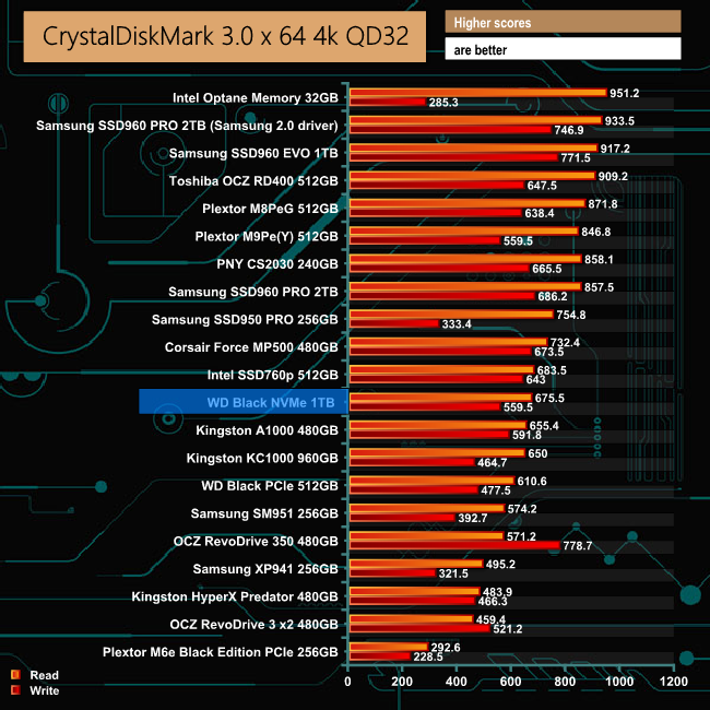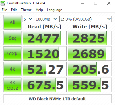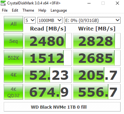 In CrystalDiskMark's 4K QD32 test the WD NVMe Black isn't quite as fast as Intel's latest SSD760p drive. At a QD of 1, though, the 4K Write performance is pretty good at 205.6MB/s. Comparing the default benchmark screen with the 0 fill test, it seems the new WD controller isn't concerned about the type of data it's being asked to handle.