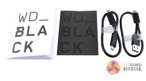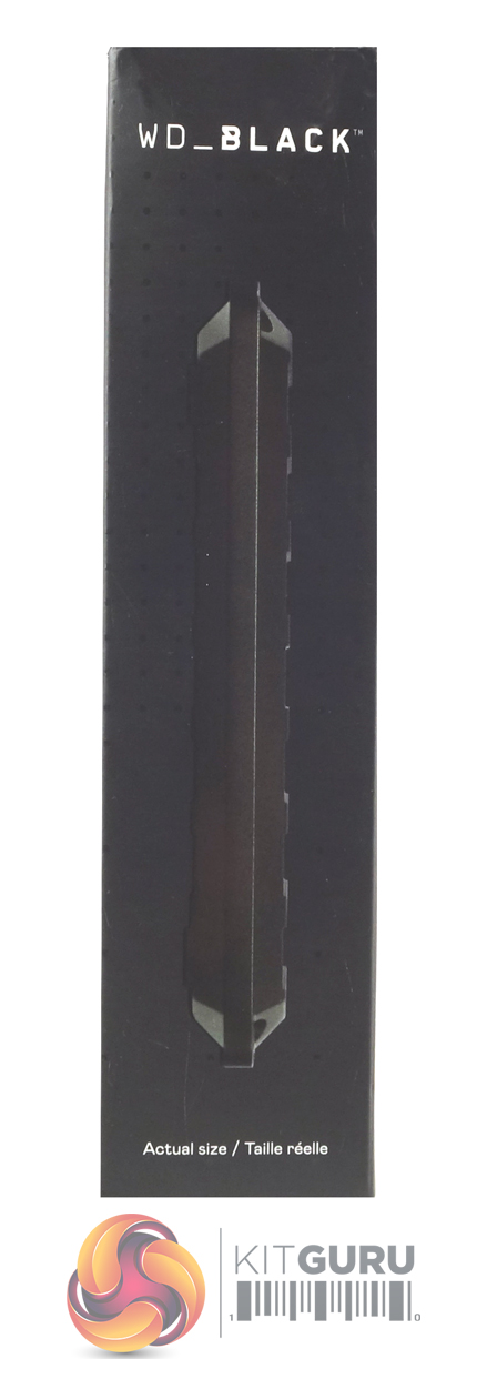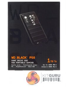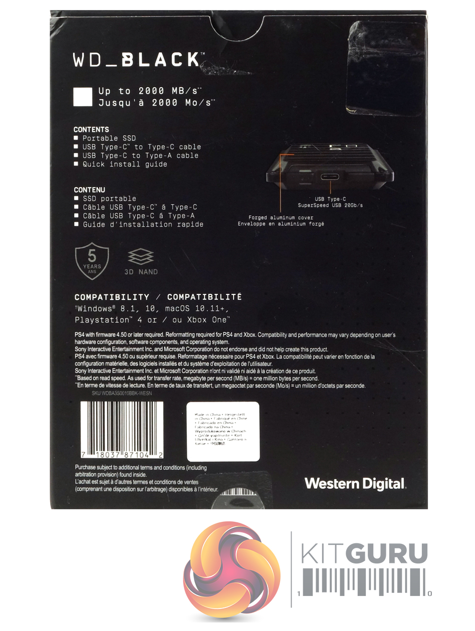 The WD Black P50 Game Drive comes in a stout box with an image of the drive on the front along with the normal WD Black branding. Under the right-hand side of the image we see the drive’s capacity and its read speed in both English and French.