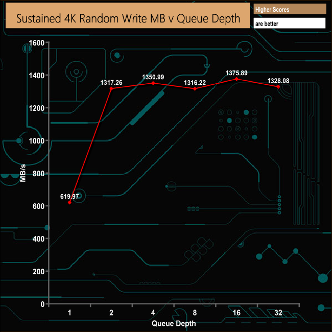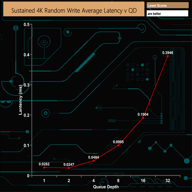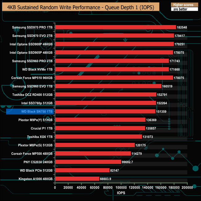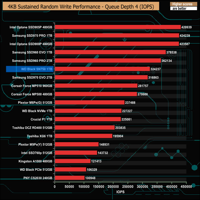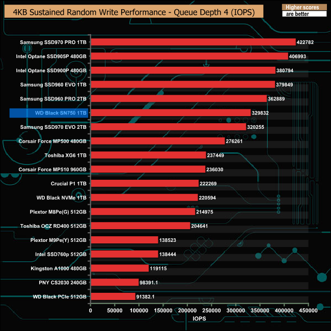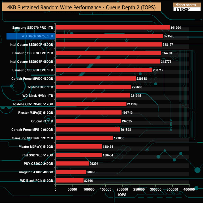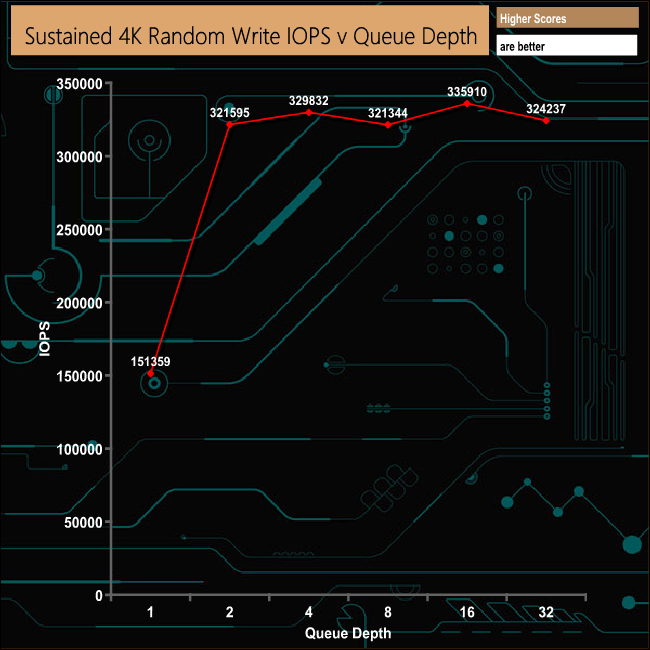In our random write tests the SN750 peaks at the QD16 mark at 335,910 IOPS still well short of the official 560,000 IOPS.