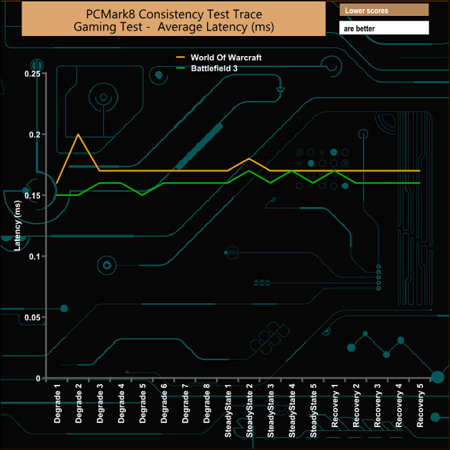 The drive handles the two casual gaming test traces very well with no sudden, dramatic dips in the test bandwidth for either test.