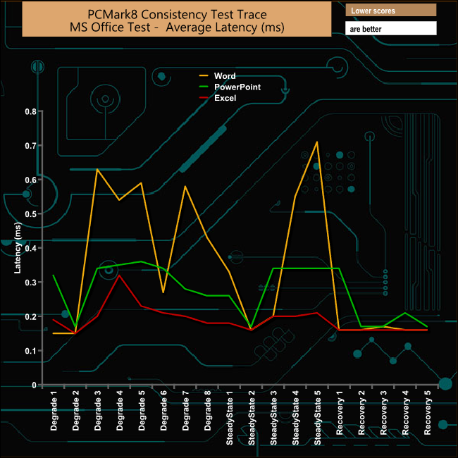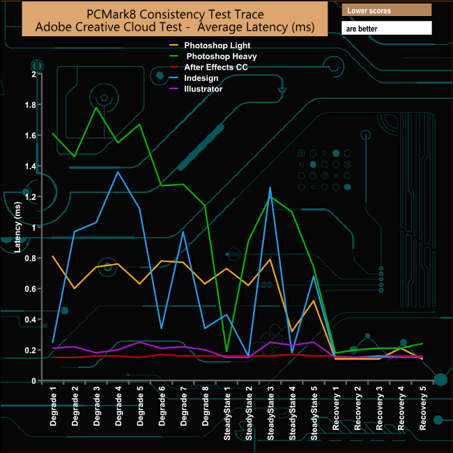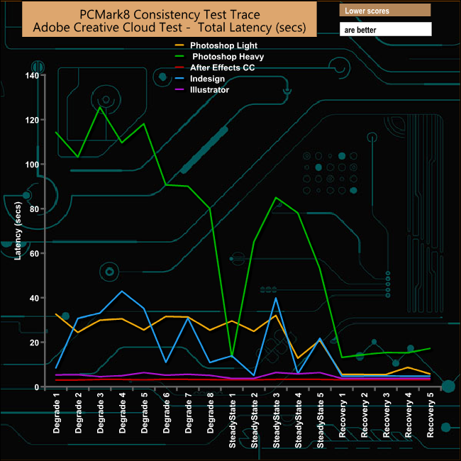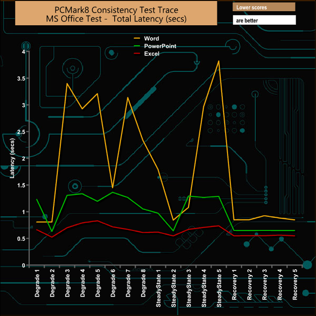 PCMark8’s Consistency test provides a huge amount of performance data, so here we’ve looked a little closer at how the WD Black SN750 performs in each of the benchmarks test suites.