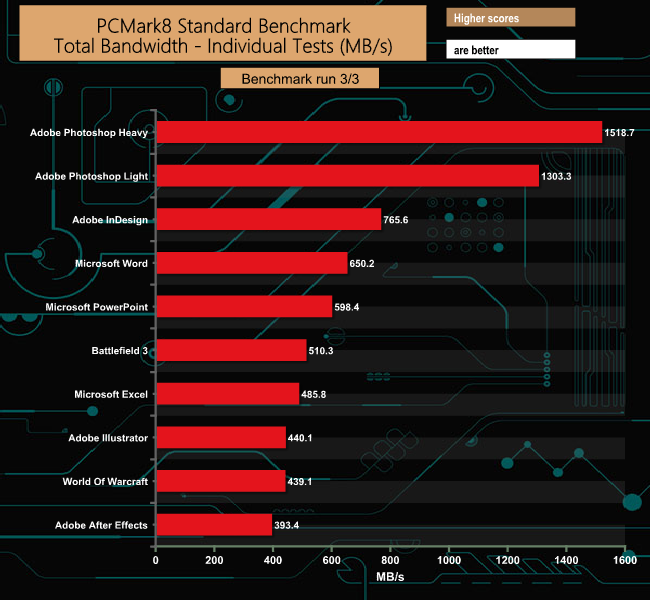 The drive produced strong bandwidth figures for each of the individual tests with the two Adobe Photoshop tests offering over 1GB/s of bandwidth.
