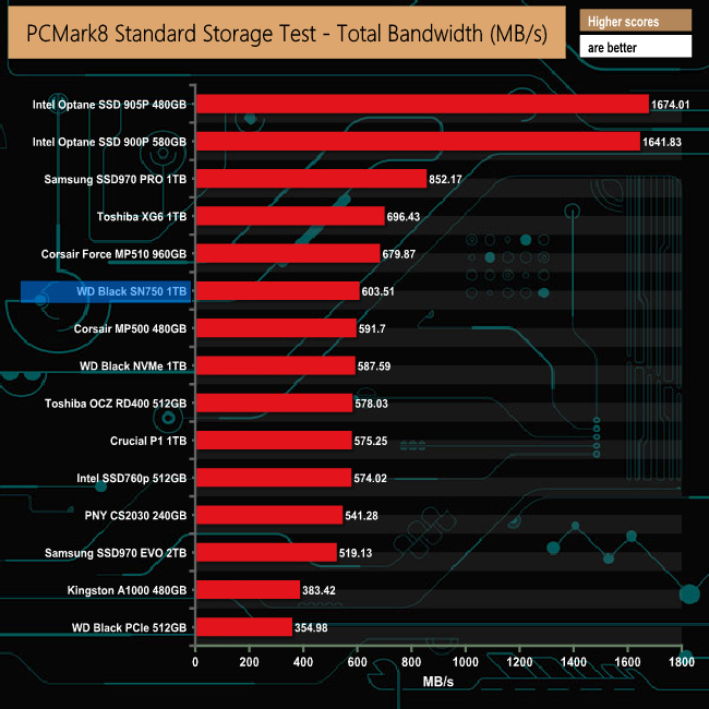 The Black SN750 produces 603.51MB/s as a bandwidth figure for the whole PCMark8 standard test, beating the 587.59MB/s of the previous Black NVMe drive.