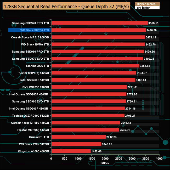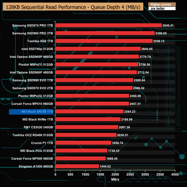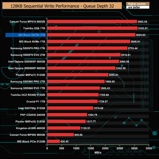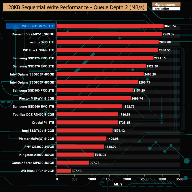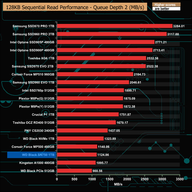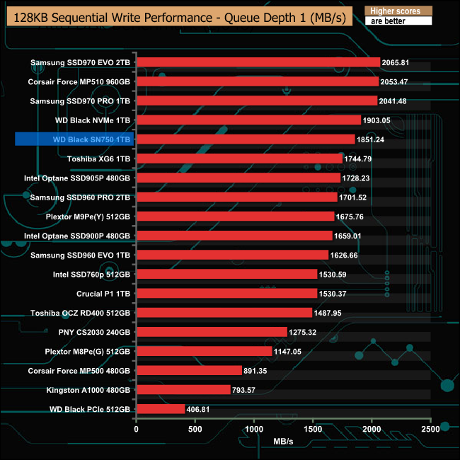 The read performance of the SN750 falls below the previous generation NVMe drive at QD2 but for QD's 1, 4 and 32 the new drive is the faster performer.