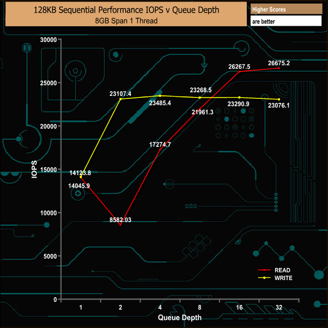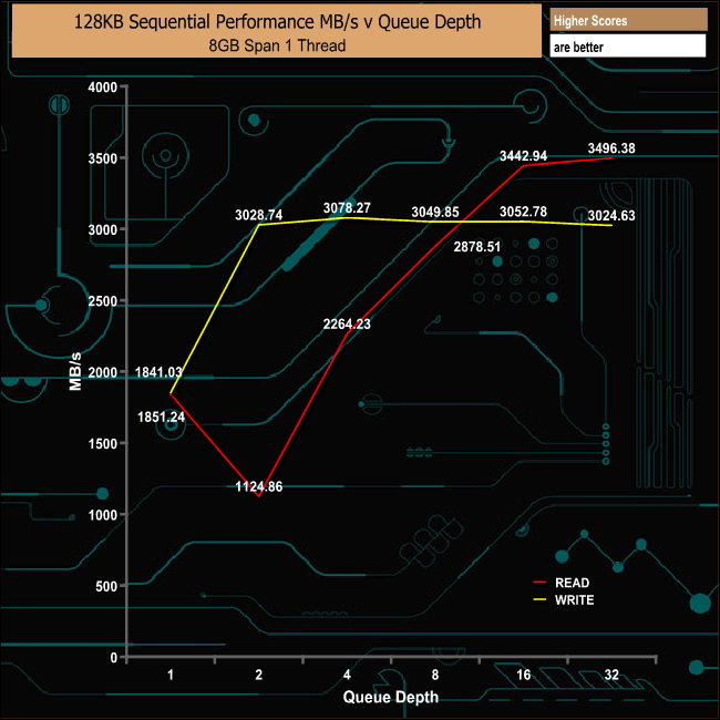 As with the ATTO benchmark results, we could confirm the official Sequential performance figures of the drive using our 128KB tests. The drive produced a read score of 3,496MB/s with writes at 3,024MB/s against the official 3,470MB/s reads and 3,000MB/s writes.