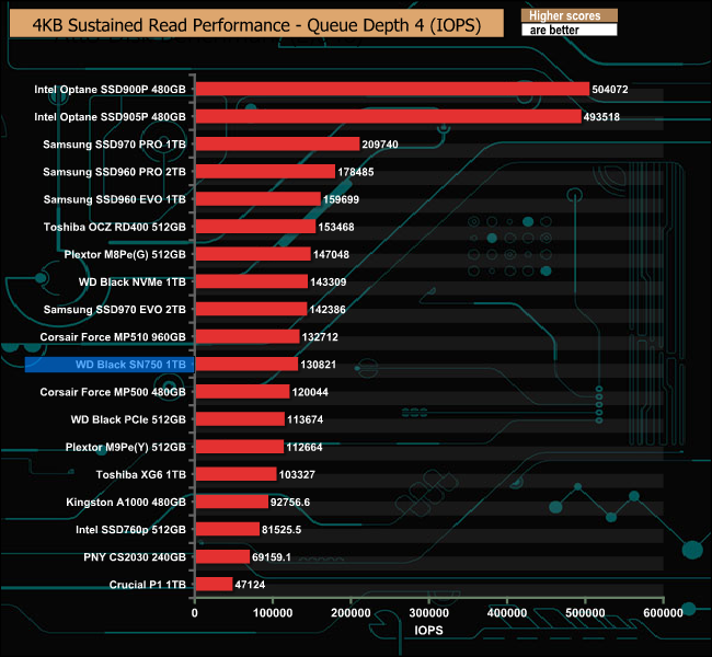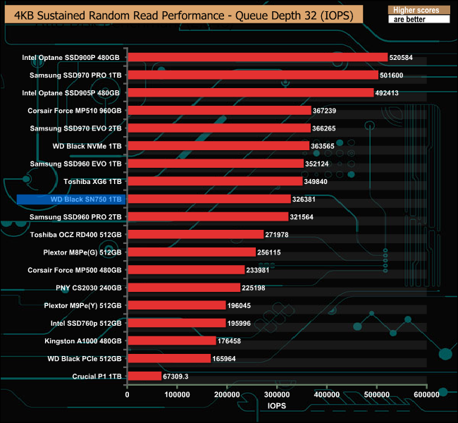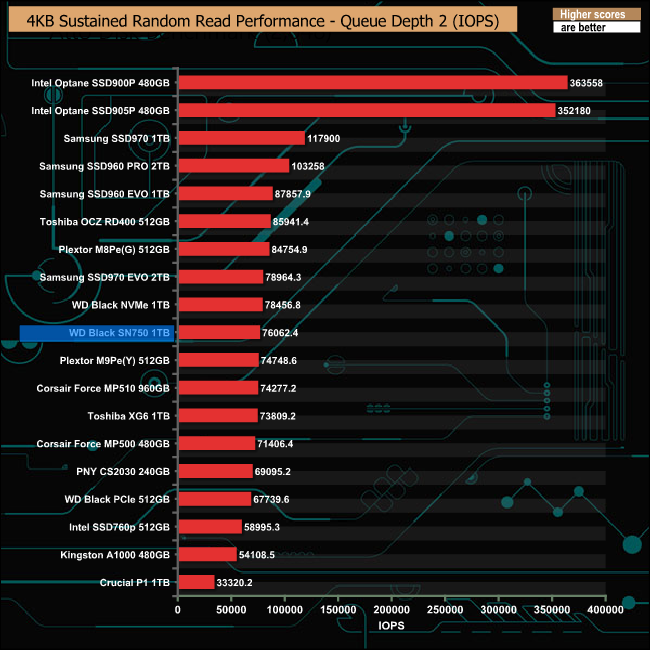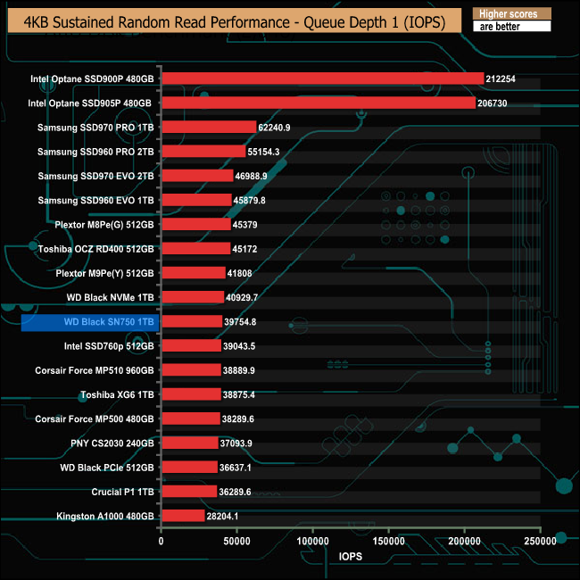 When it comes to random reads, the SN750 trails the older WD Black NVMe drive in all of our tested queue depths.