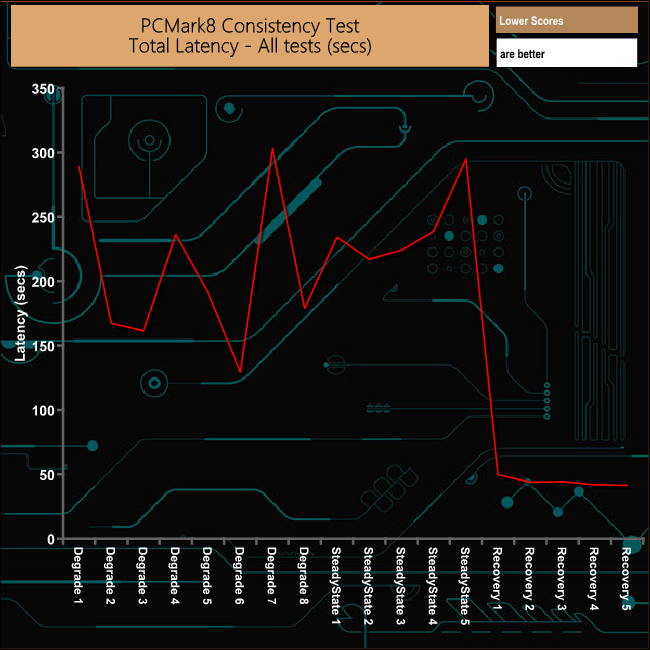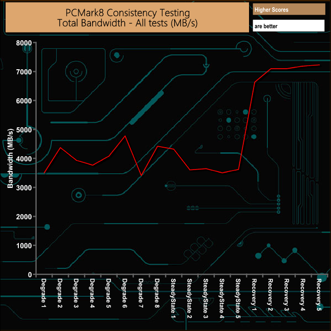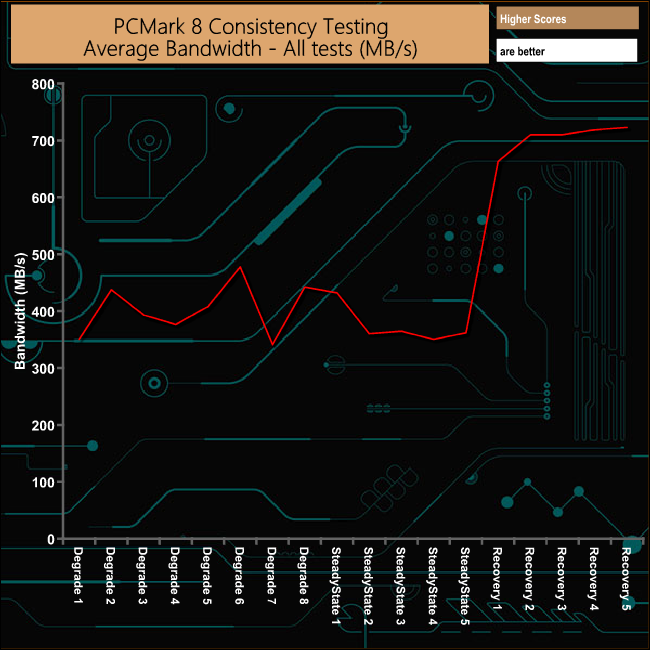 In PCMark8’s Consistency Test, the drive does pretty well overall. It does get hit pretty hard during some of the Degradation and SteadyState tests but the overall recovery of the drive is very good and pretty consistent.