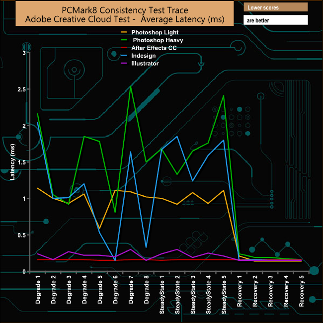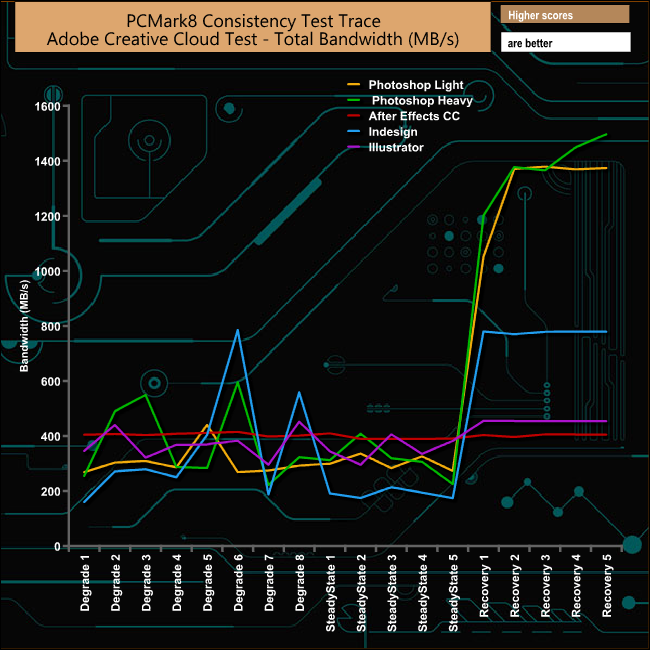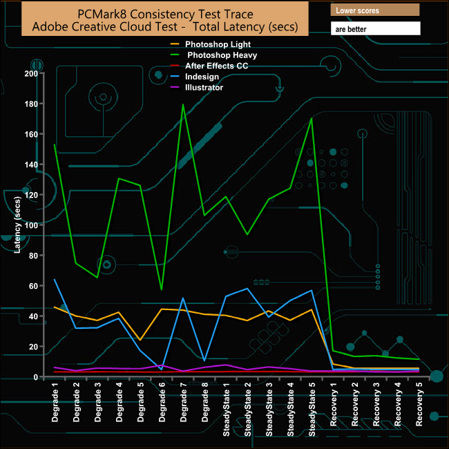 The drive suffers during the rigours of the Degradation and Steady State phases of the Adobe C.C. test with all the test traces having problems with the exception of the After Effects trace. However the drive recovers well, particularly during the Photoshop Light and Heavy trace runs.