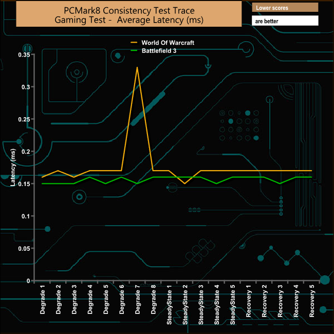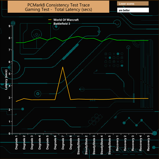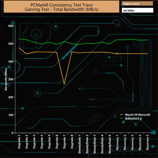 Apart from the dramatic dip in the bandwidth in the World Of Warcraft test during the seventh Degradation run the drive handles the two casual gaming test traces very well.