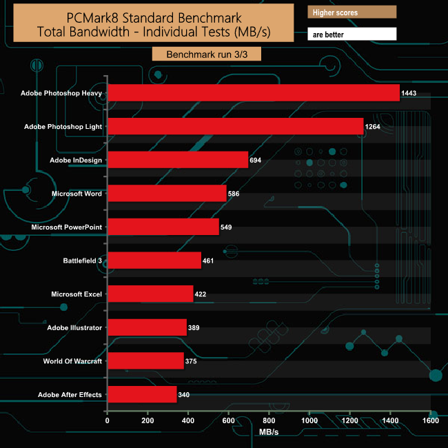 The drive produced strong bandwidth figures for each of the individual tests with the two Adobe Photoshop tests offering over 1GB/s of bandwidth.