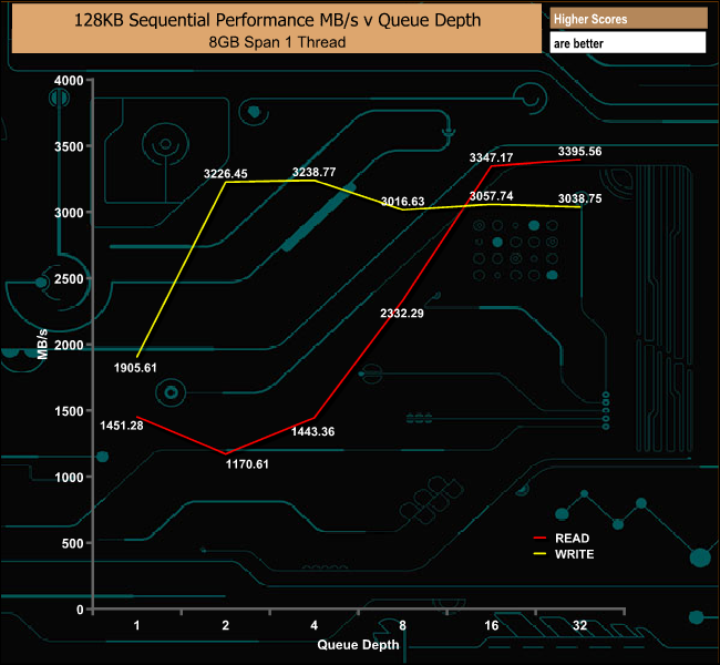 In our 128KB Sequential tests, the review drive didn't perform quite as well as it did in the ATTO tests, with reads of 3,395.56MB/s and writes of 3,038.75MB/s. The read figure is a little shy of the official 3,470MB/s while the write figure is a little better than the official 3,000MB/s.