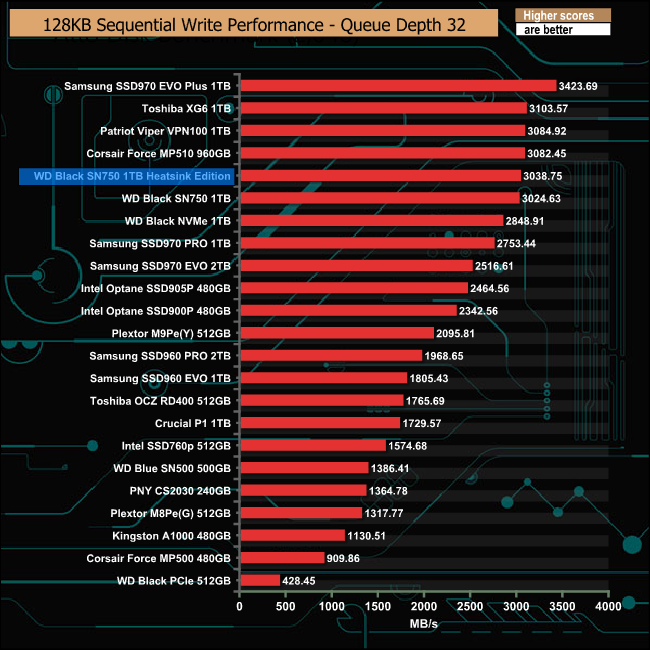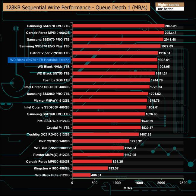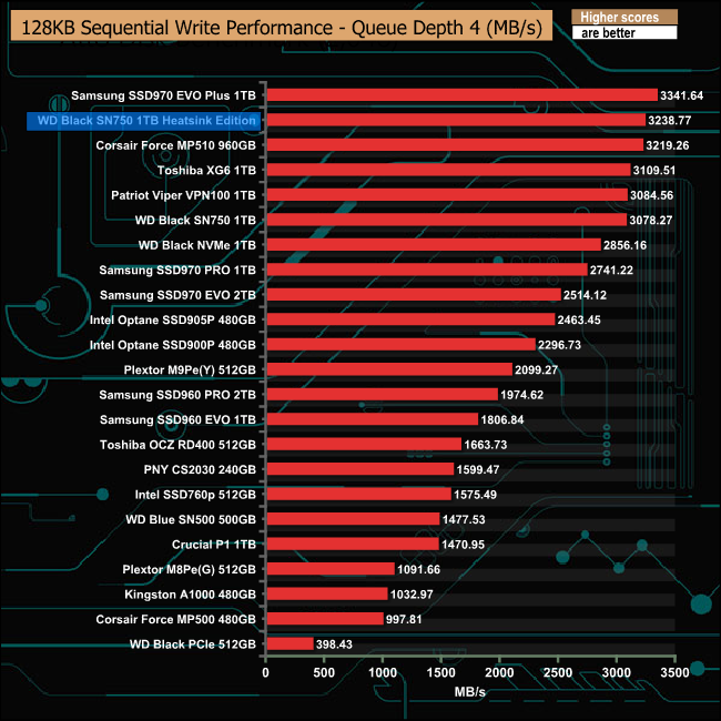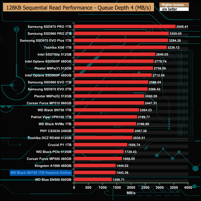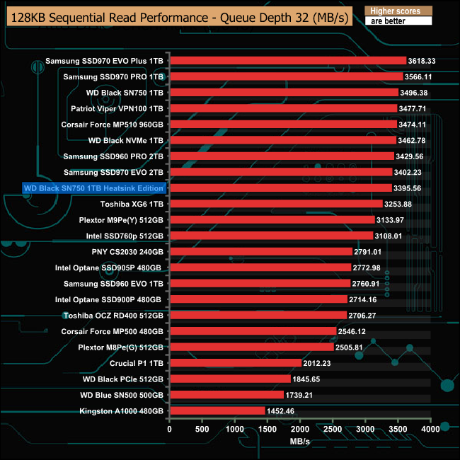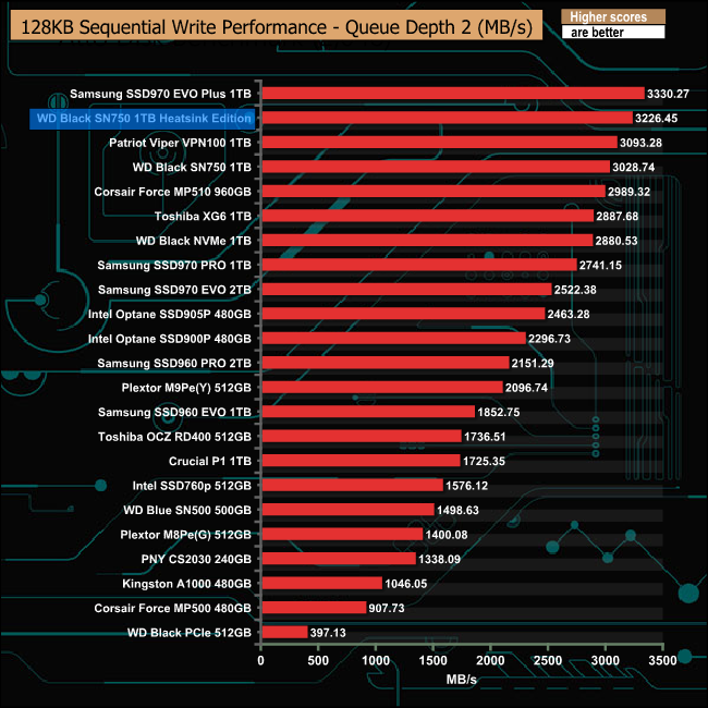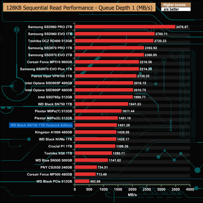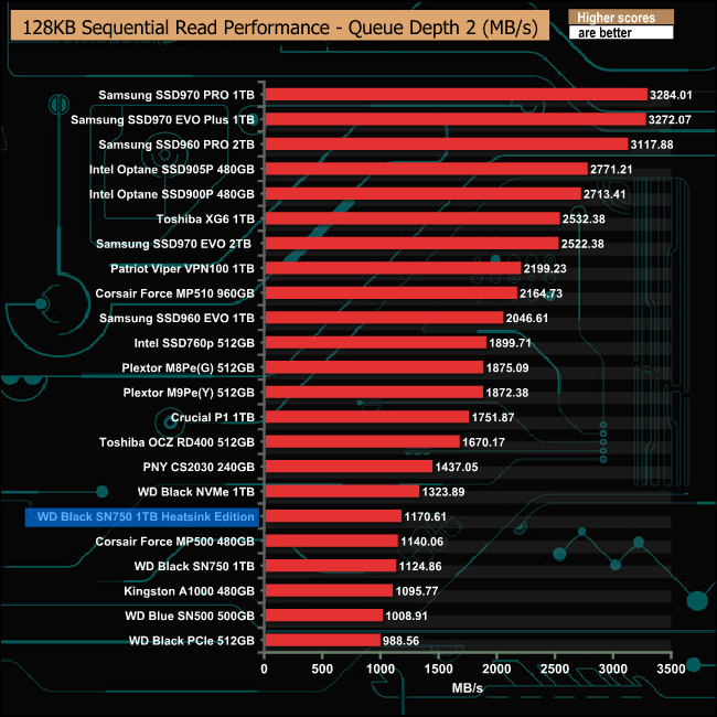 With the exception of the QD2 performance, our review sample Black SN750 Heatsink Edition trailed behind the standard drive in our Sequential read tests.