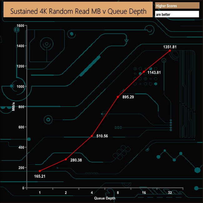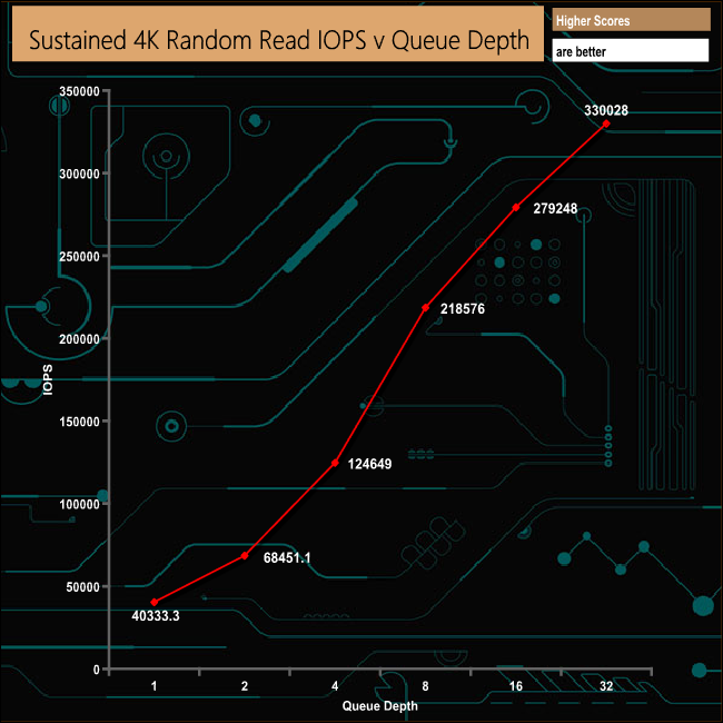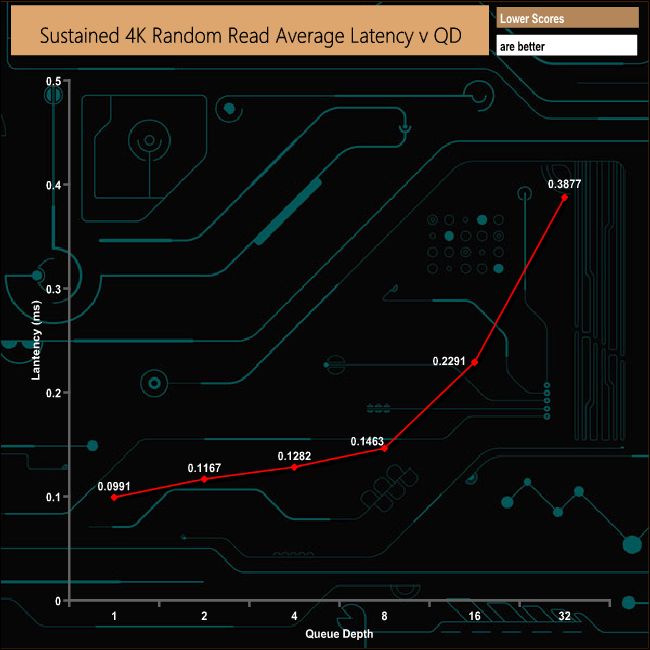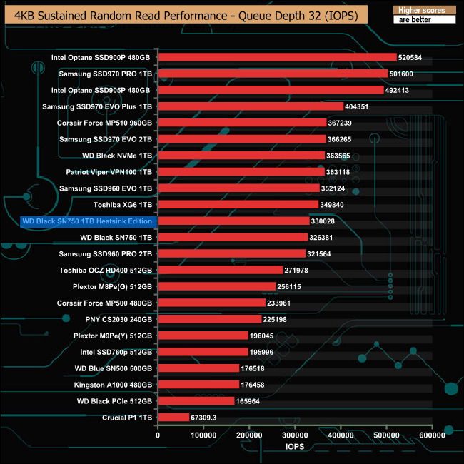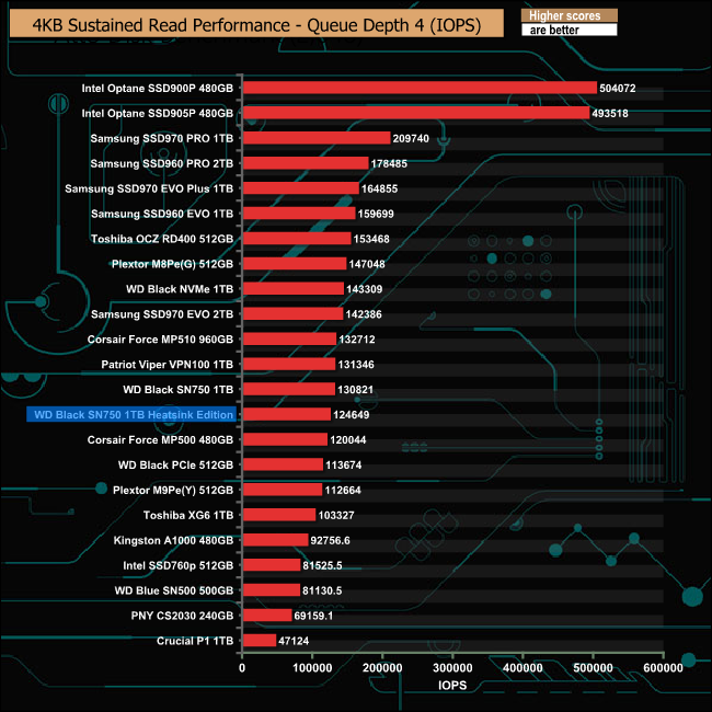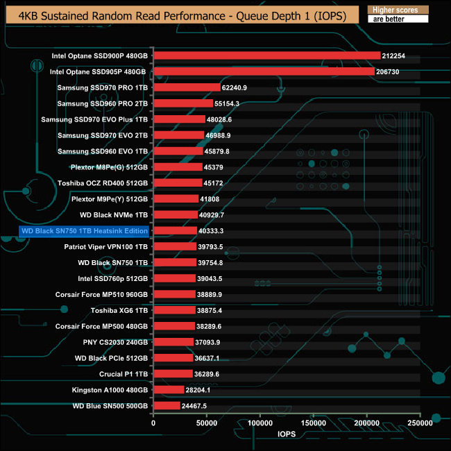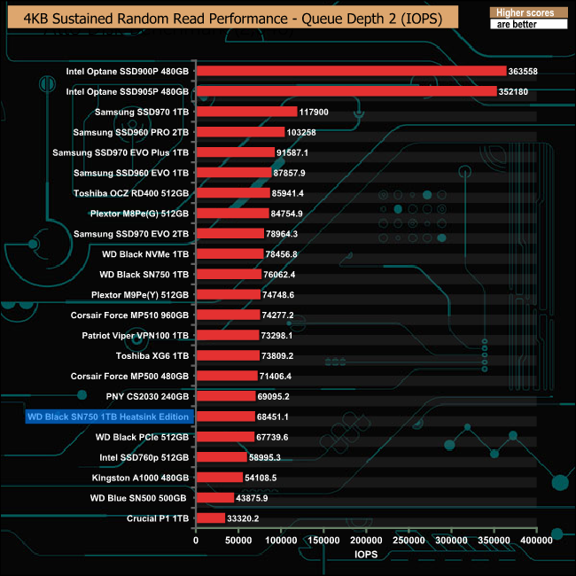 The official 4K random read figure for both versions of the 1TB SN750 is up to 515,000 IOPS. Under our tests the drive got nowhere near the official maximum figure. However the drive performs very smoothly as it climbs through the various queue depths.