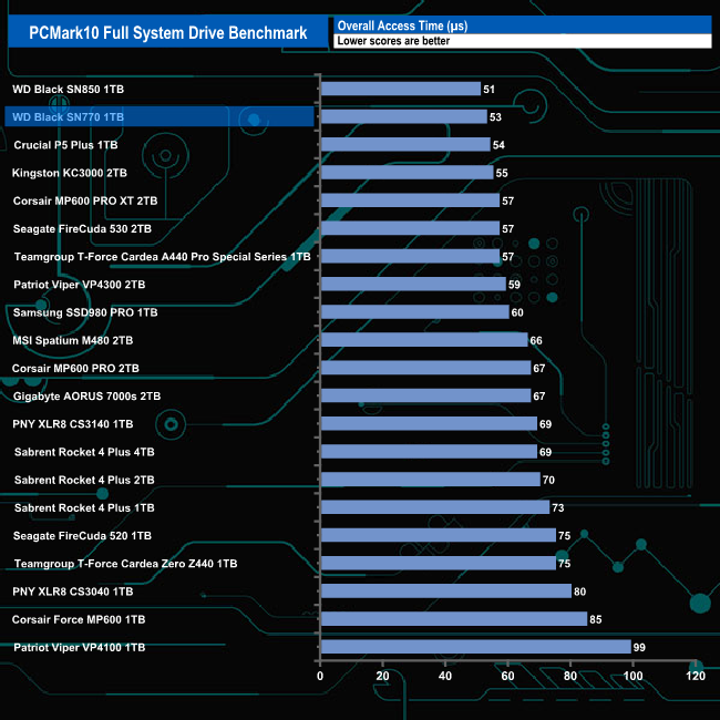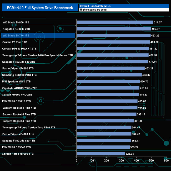 The overall bandwidth figure of 493.29MB/s sees the WD Black SN770 slip into third place in our result chart behind Kingston’s KC3000 and WD's other Gen4 drive, the SN850.