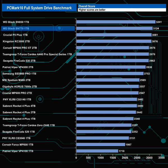 The WD Black SN770 dealt with the rigours of the PCMark10’s Full System Drive pretty well. The best result from the Creative set of test traces was the 952MB/s for the Heavy Use Adobe Photoshop trace while the 497MB/s for the Adobe After Effects use trace is very good. The file transfer tests also produced a good cp1 (write test) figure of 3,818MB/s backed up by the 3,495MB/s for the cp3 (read test) and 3,436MB/s for the cp2 read/write test traces.