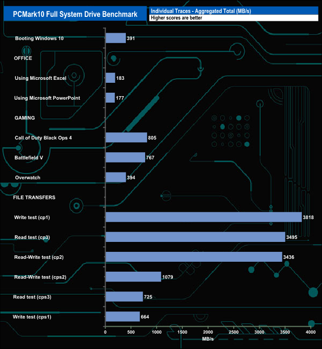 The PCMark 10 Full System Drive Benchmark uses a wide-ranging set of real-world traces from popular applications and common tasks to fully test the performance of the fastest modern drives. The benchmark is designed to measure the performance of fast system drives using the SATA bus at the low end and devices connected via PCI Express at the high end.