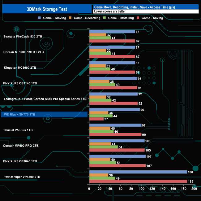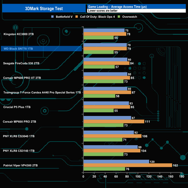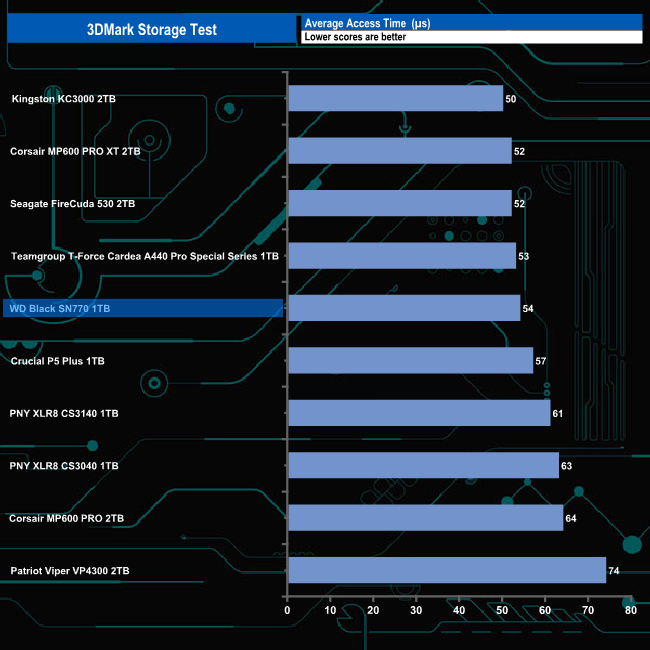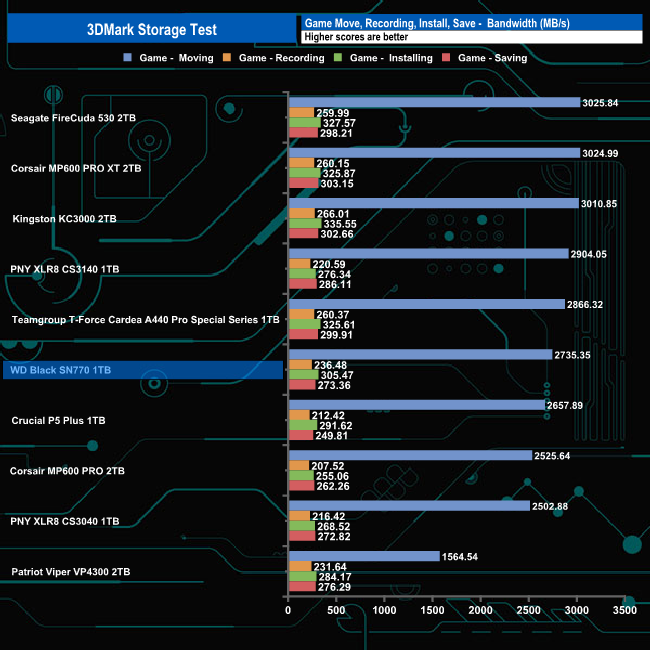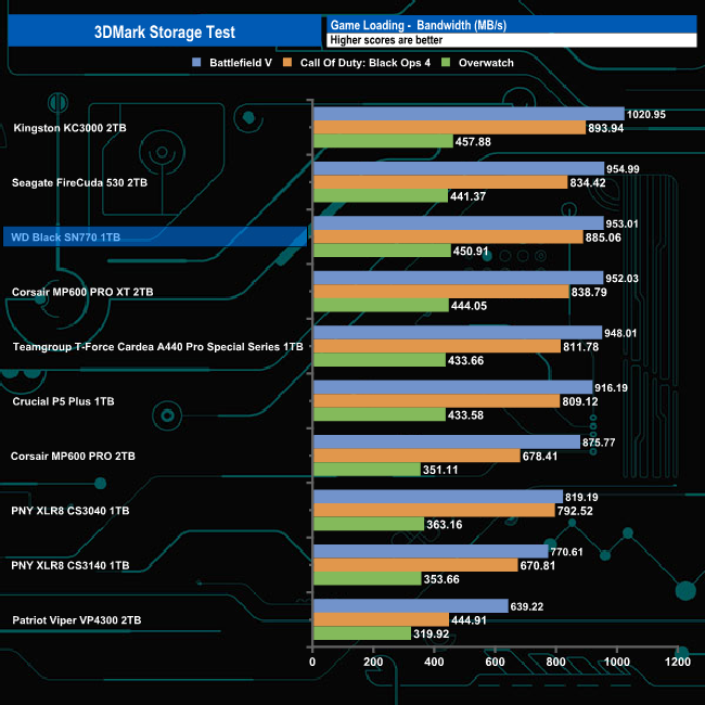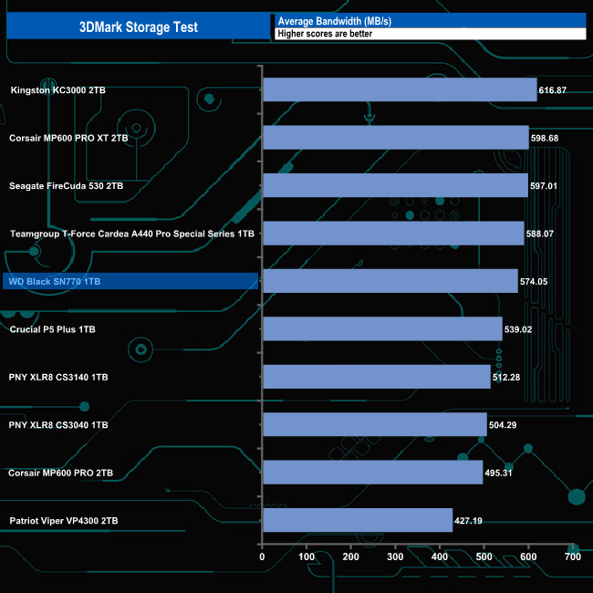 In 3DMark's Storage Test, the Black SN770 had an average bandwidth figure of 763MB/s for the three game load tests and an overall average bandwidth for the complete test run of 574.05MB/s.