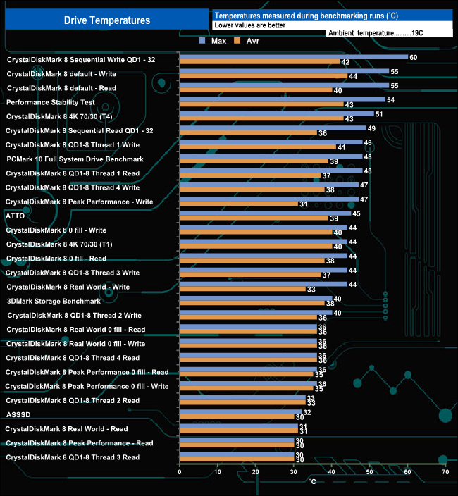 We took note of the drive’s temperature during some of our benchmarking runs. The WD Black SN770 doesn’t have a heatsink, but there is plenty of empty space on the PCB to allow air circulation around the components. The hottest the drive got was when it was being pushed very hard during the Sequential write test using CrystalDiskMark8, when it peaked at 60° C which is 25° C under the maximum operating temperature.