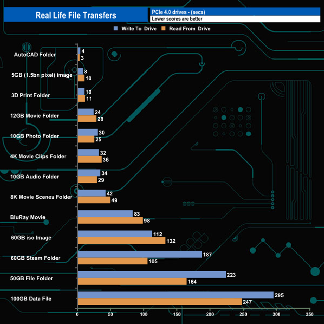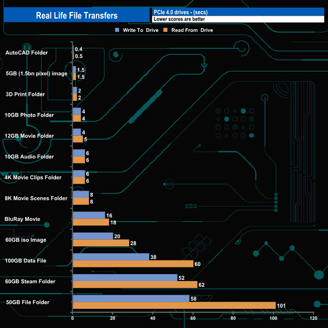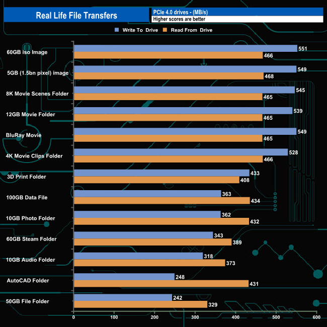 The drive was pretty consistent when dealing with the larger file transfers in our real-life file transfer tests averaging 543.5MB/s writing six of the largest folders to the drive and 465MB/s when reading them back. The fastest transfer was for the 60GB iso image (551MB/s) with the slowest being the 50GB file folder transfer at 242MB/s.