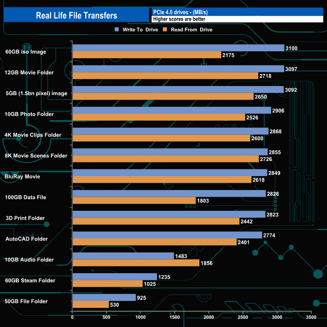 Swapping over to an all NVMe architecture saw transfer speeds rocket as you might expect. Three of the write transfers topped 3GB/s; 60GB iso 3,100MB/s, 12GB Movie Folder 3,097MB/s and the 5GB (1.5bn pixel) image. 3,092MB/s. Seven more topped 2.5GB/s while the slowest was the 50GB file folder with 925MB/s writing and 530MB/s reading.