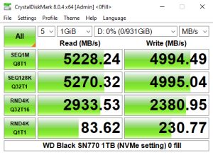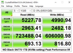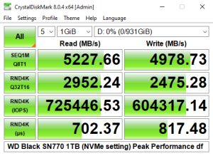 When the drive was tested with the Peak Performance profile in CrystalDiskMark 8 we could again confirm the official maximum read/write Sequential ratings of 5,150MB/s and 4,900MB/s with a read result of 5,227MB/s (default) and a best write result of 4,990MB/s (0 fill).
