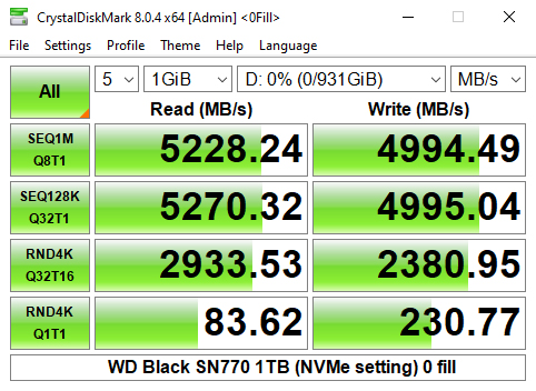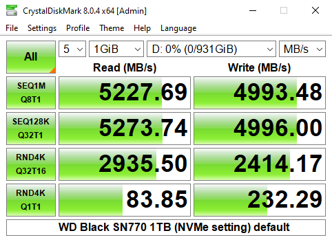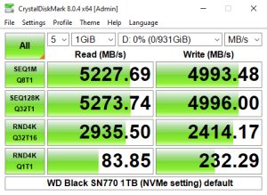 Using the default CrystalBenchMark 8 benchmark we could confirm the official read/write maximums of 5,150MB/s and 4,900MB/s with test results of 5,227MB/s and 4,993MB/s for read and writes respectively.