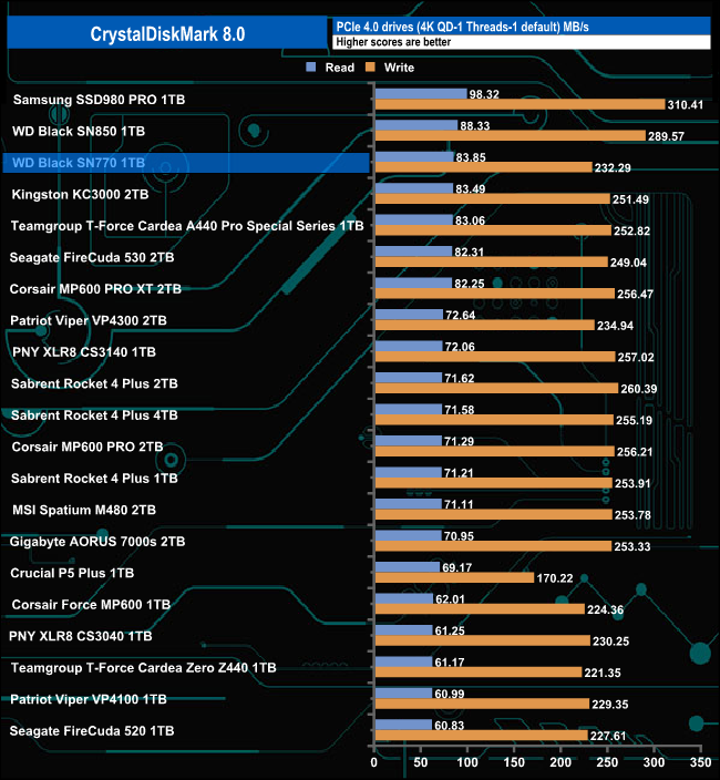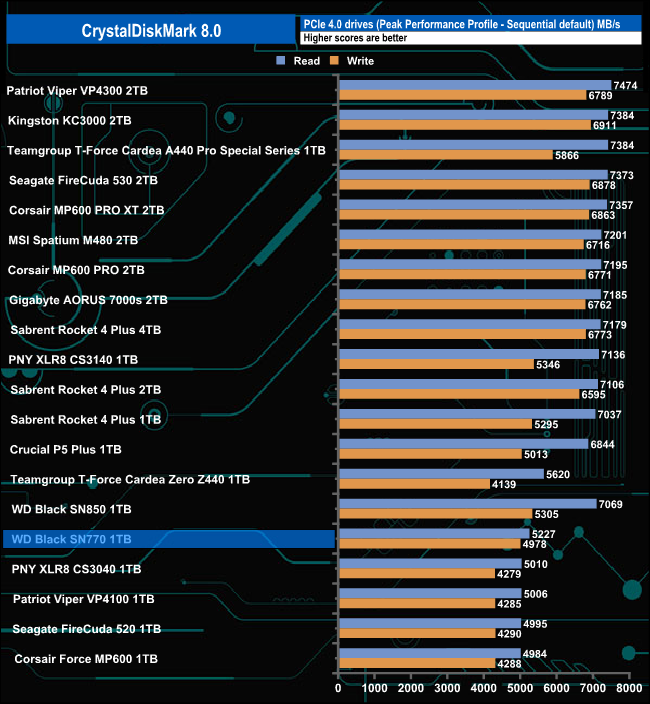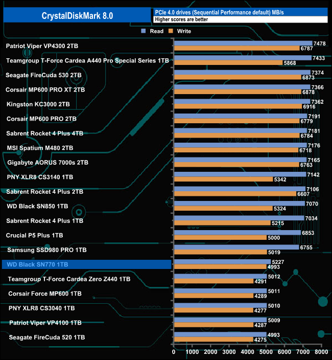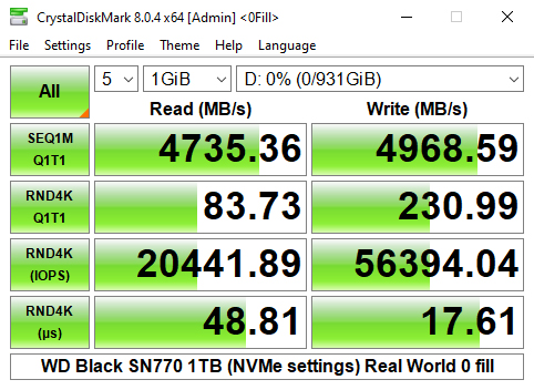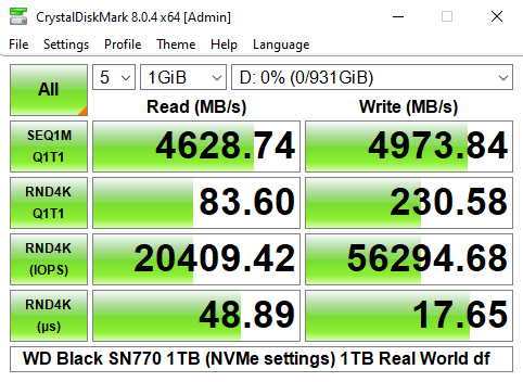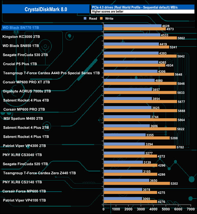 Using the Real World profile, the Sequential score of 4,628MB/s was good enough to see the Black SN770 at the top of the results table. However, its write result of 4,973MB/s wasn't nearly as strong when compared to drives around it in the results chart.