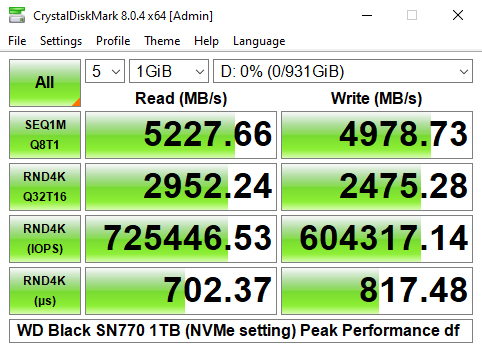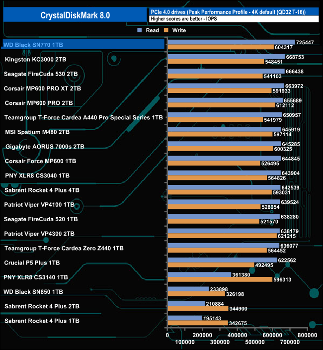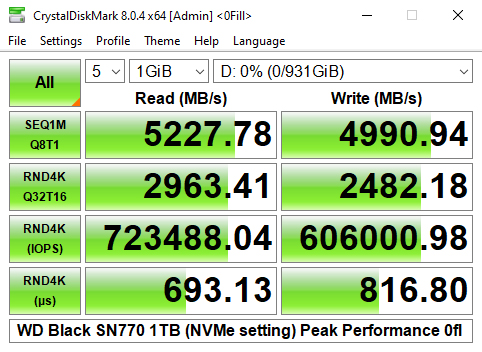 The official random 4K ratings for the 1TB Black SN770 are up to 740,000 IOPS for reads and up to 800,000 IOPS for writes. We couldn't match either of these maximums with CrystalDiskMark's Peak Performance profile but with a best test result of 725,446 IOPS the read performance was much closer to the official maximum than the 604,317 IOPS write figure.