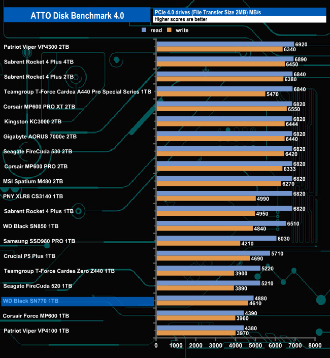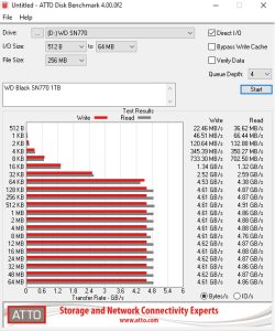 The official Sequential read/write ratings for the 1TB Black SN770 are up to 5,150MB/s for reads and up to 4,900MB/s for writes. Using the ATTO benchmark we couldn't quite match those maximums with result figures of 4,880MB/s and 4,610MB/s for reads and writes respectively.