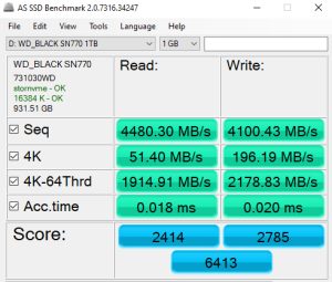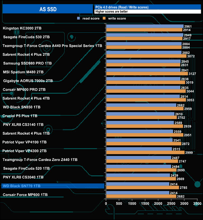 With a read score of 2414 in the AS SSD benchmark, the drive is to be found near the bottom of the results chart but its write score of 2785 is pretty good.