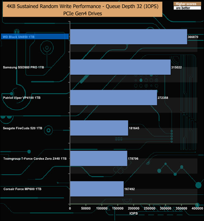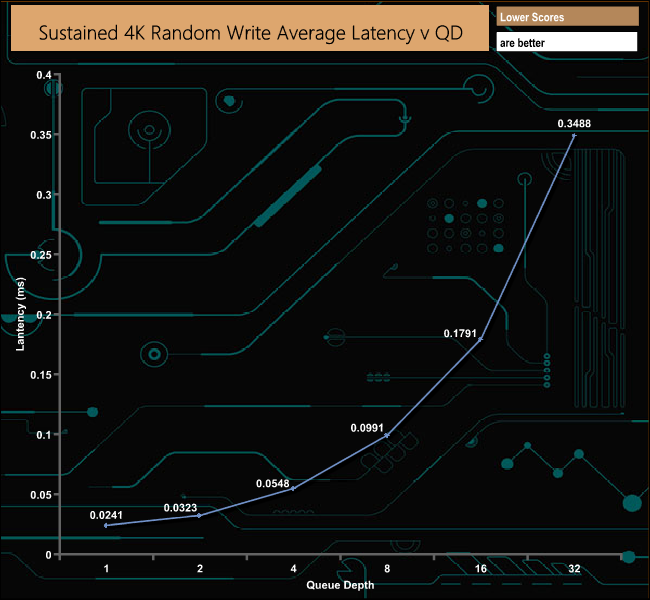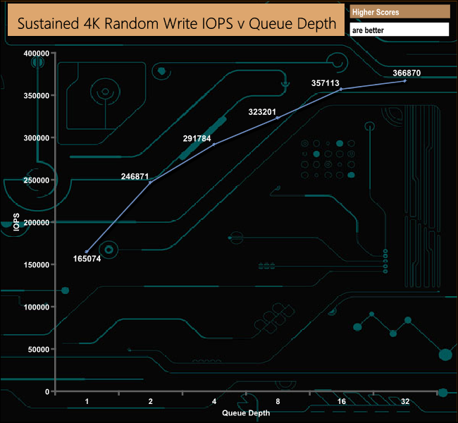 As with the random read testing, our test results fall way short of the official rating of 720,000 IOPS for random writes. The best write figure we saw with our 4-threaded testing was 366,870 IOPS (QD32). Once again we did a quick test using 16 threads at a QD of 32 which produced a performance figure of 611,422 IOPS.