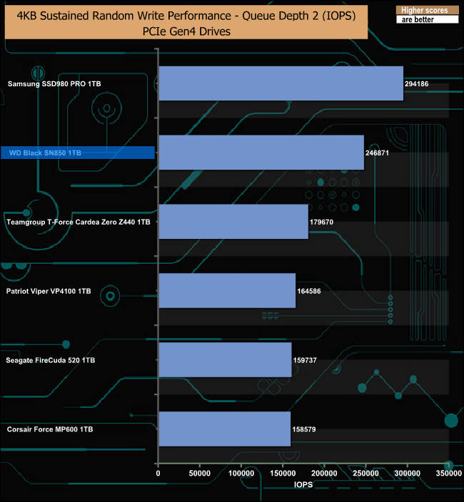 The Black SN850 leads the way at QD1 but quickly falls behind the Samsung SSD980 PRO before regaining the top spot at QD32.