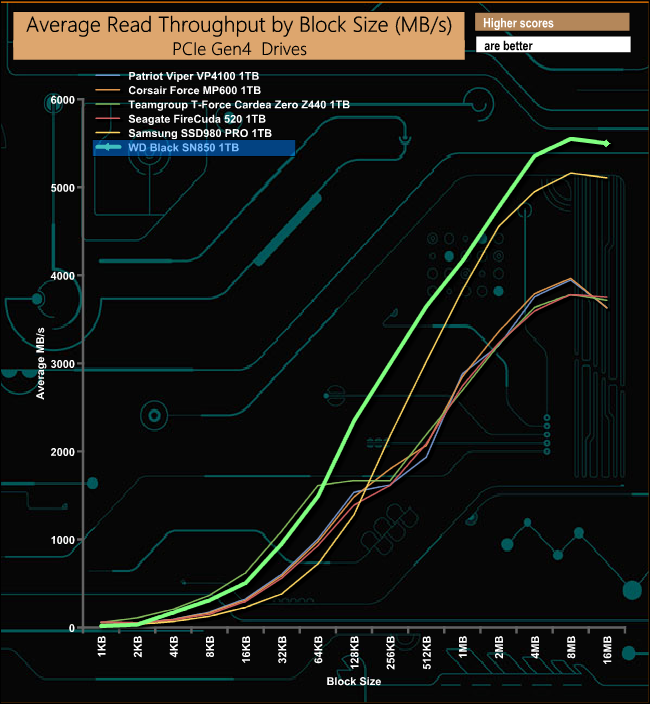Despite falling short of the official maximum of 7,000MB/s, the WD Black SN850 has the fastest read speed in our throughput test by quite some margin.