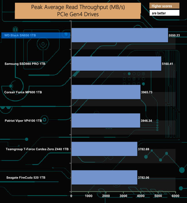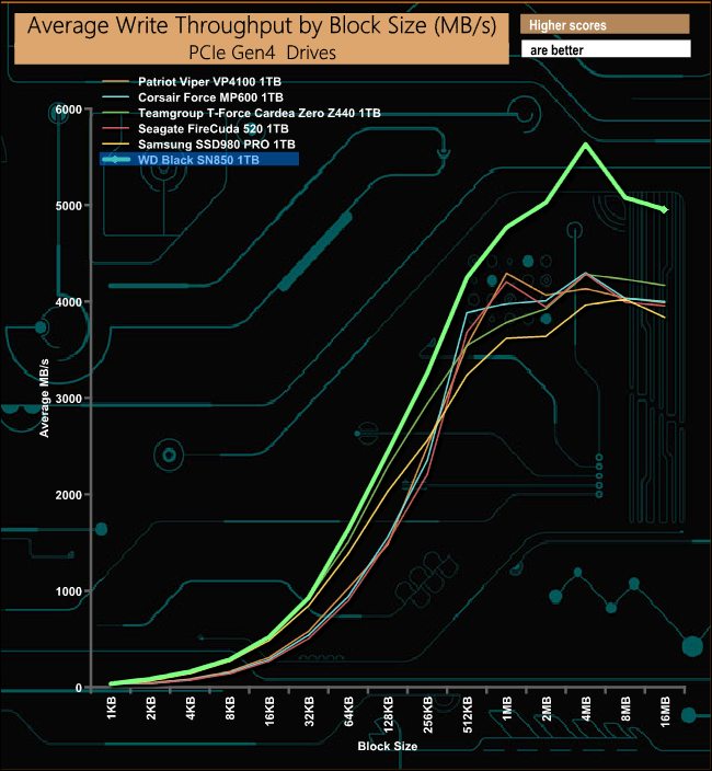 As with our read throughput test, the write throughput performance puts the WD Black SN850 at the top of the pile by an even bigger margin than the read performance.