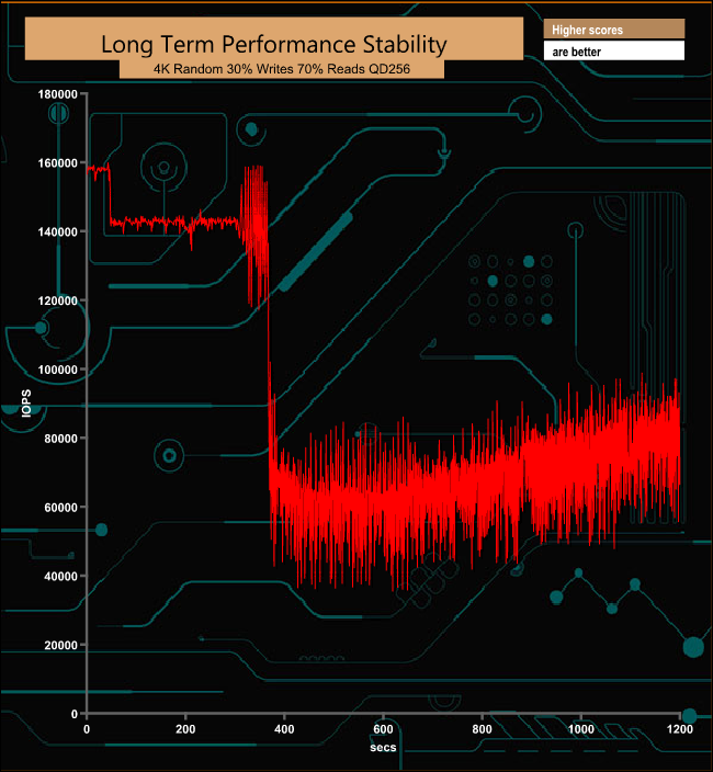 For the long term performance stability test, we set the drive up to run a 20-minute 4K random test with a 30% write, 70% read split, at a Queue Depth of 256 over the entire disk. The 1TB SN850 averaged 91,418 IOPS for the test with a performance stability of 58%.