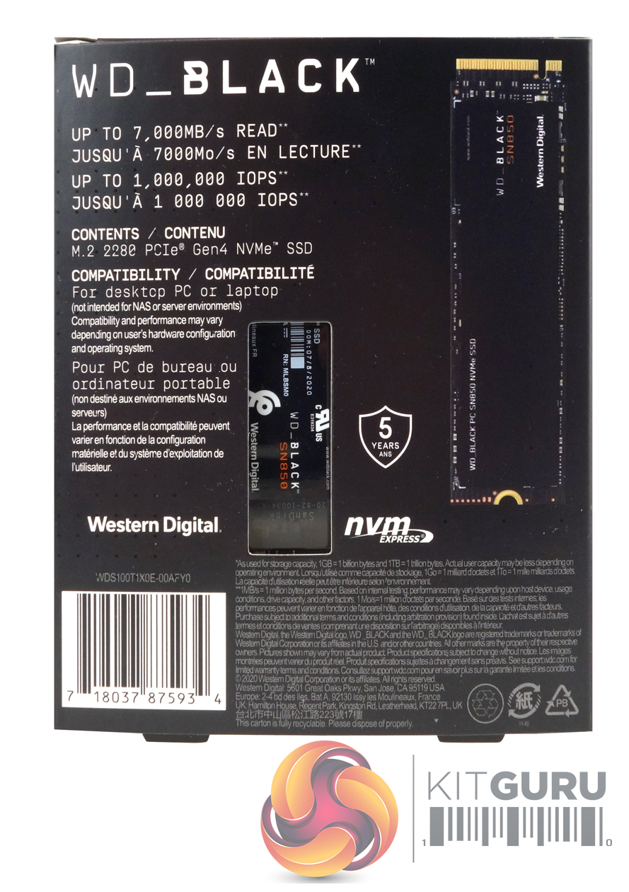 The drive arrives in a smallish box with a clear image of the drive on the front. WD is obviously keen to let you know that this is a fast drive, too, as the 7,000MB/s Sequential read figure is displayed in the bottom right corner of the box. Above this WD highlights the interface the drive uses and its capacity.