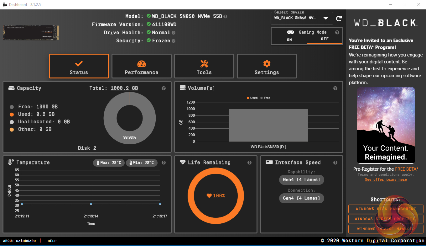 WD's SSD management utility goes by the name of Dashboard. Dashboard is pretty comprehensive and allows you to monitor drive status, performance, perform secure erases (currently only by making a bootable USB device), update firmware and monitor temperatures. It also includes a gaming mode which if enabled reduces latency by disabling the low power modes via the firmware.