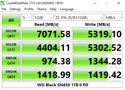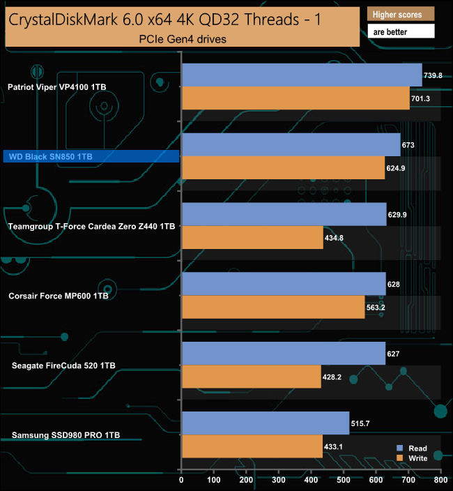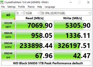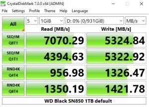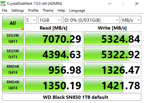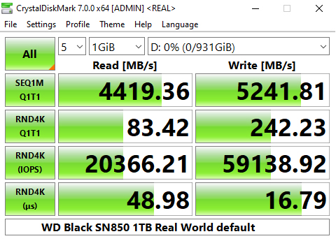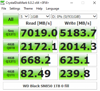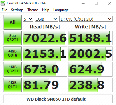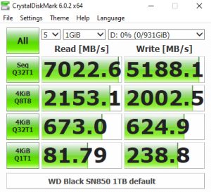 In the CrystalDiskMark v6.0.2 4K QD32 test the WD Black SN850 sits in second place behind Patriot's VP4100 drive. Using this benchmark we could confirm the official 7,000MB/s Sequential read figure with a test result of 7,022MB/s. However, the write result of 5,188MB/s is a little short of the official 5,300MB/s.