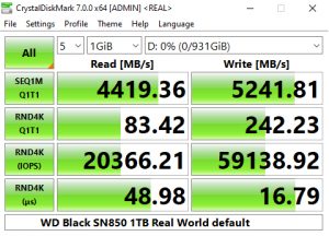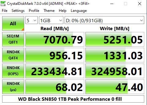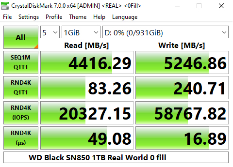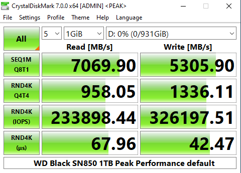 The latest version of CrystalDiskMark, version 7, includes a couple of profiles that can be used for testing – Peak Performance and Real World. The result screens for these two profiles not only display MB/s results but also IOPS and latency.