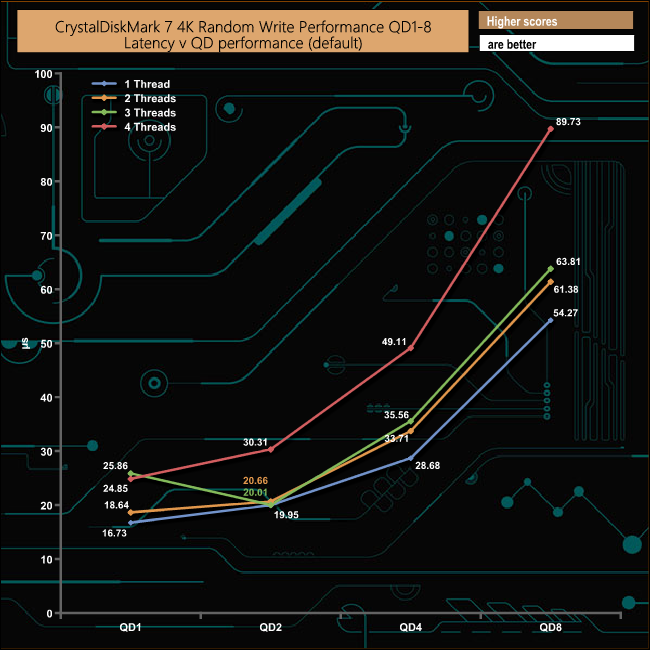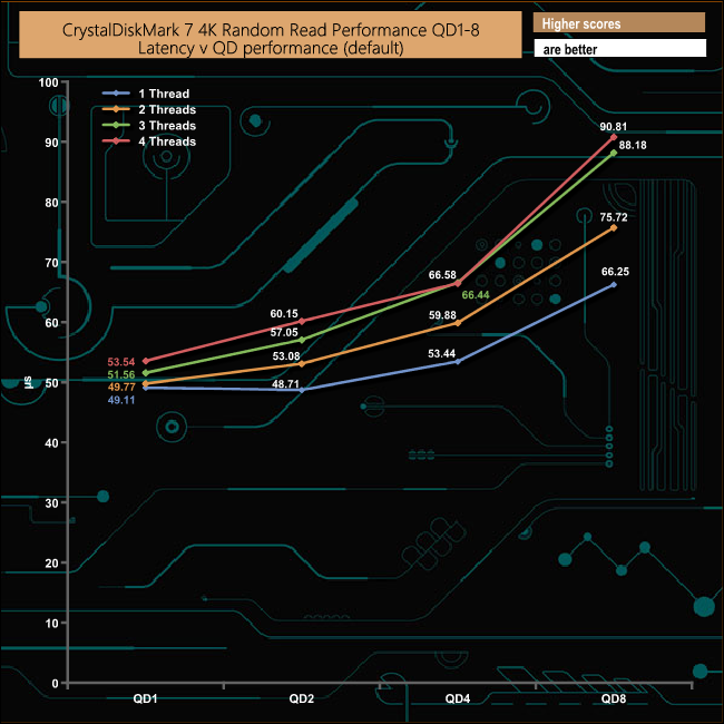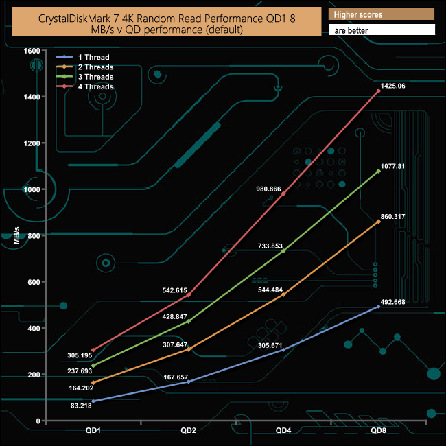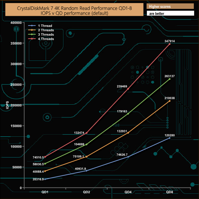 We also used CrystalDiskMark 7 to test the random performance of the drive at lower queue depths (QD1 – QD8) where most of the everyday workloads occur) using 1 to 4 threads. The WD Black SN850's read performance climbs smoothly throughout the tested queue depths and threads with a peak performance figure of 347,914 IOPS (1,425MB/s) at QD8.