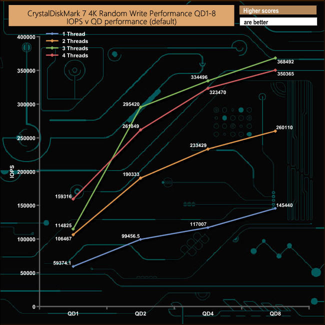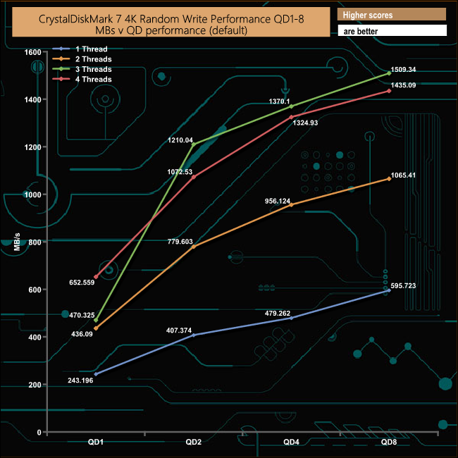 In the write tests, the best performance came from the three threaded test run which reached 368,492 IOPS (1,509MB/s) at QD8.