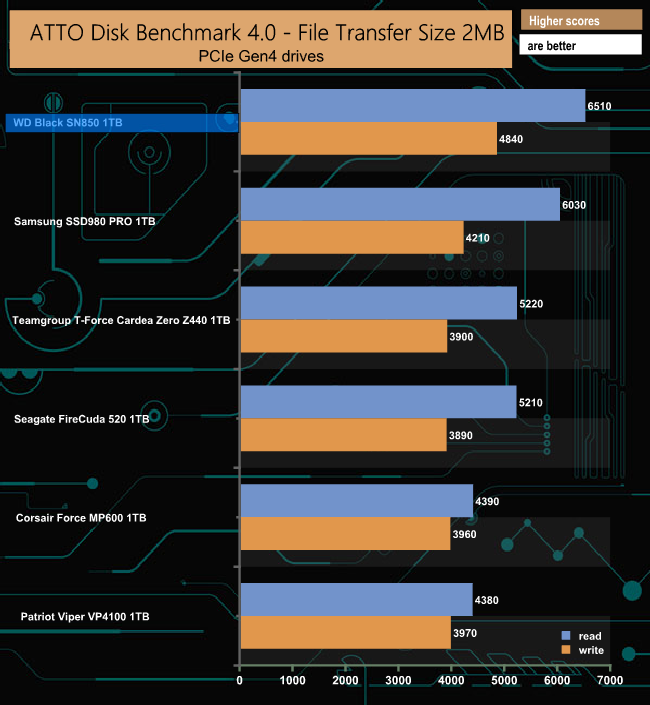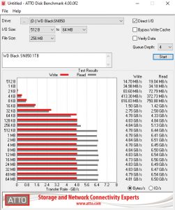 The 1TB Black SN850 is rated as up to 7,000MB/s for Sequential reads and up to 5,300MB/s for writes. Although we couldn't hit those maximums with the ATTO benchmark, the test results of 6,510MB/s for reads and 4,840MB/s for writes are the fastest we have seen to date for a PCIe Gen 4 drive.