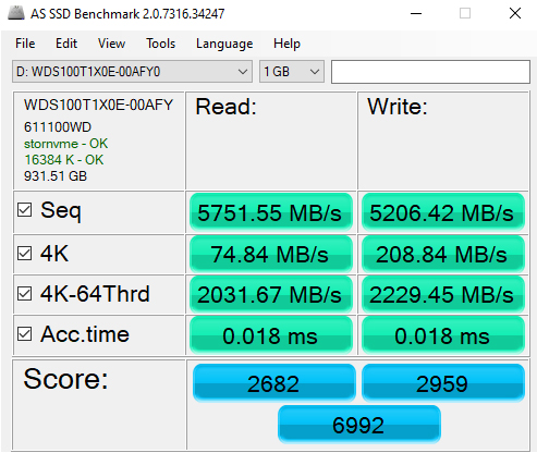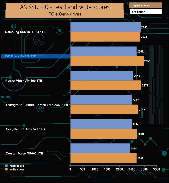 Although the WD Black SN850's read score of 2682 is only good enough for second spot behind Samsung's SSD980 PRO drive, its write score of 2959 is the fastest we have seen to date for a Gen 4 drive.