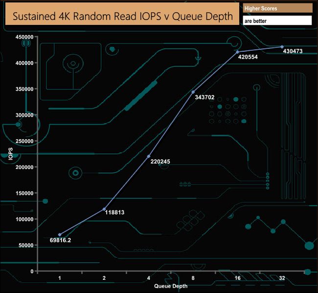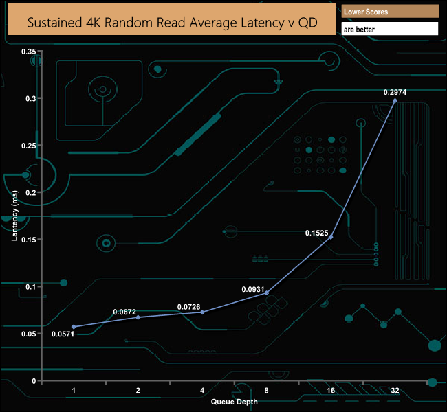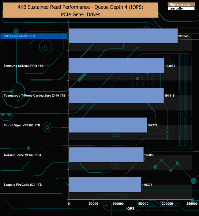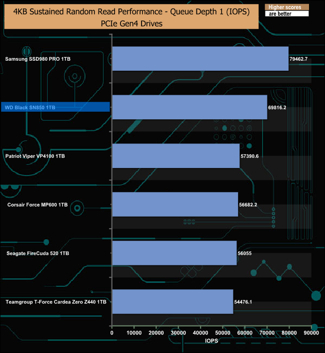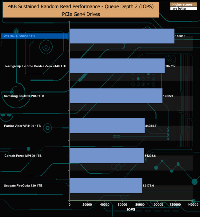 At a QD of 1, the WD Black SN850 trails the Samsung SSD980 PRO but after that, the WD drive rules the roost of all the tested queue depths.