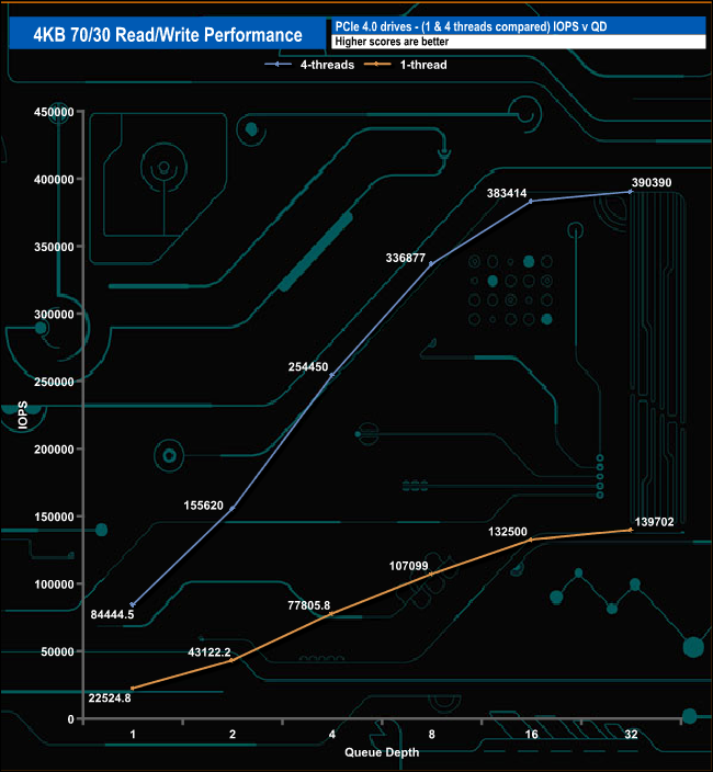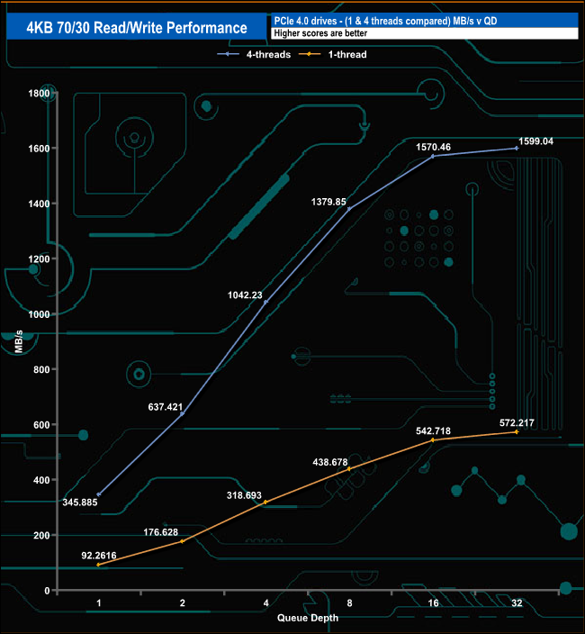 We used CrystalDiskMark 8’s custom settings to test the 4K 70/30 mixed read/write performance of the drive through a range of queue depths using a single thread and four threads.