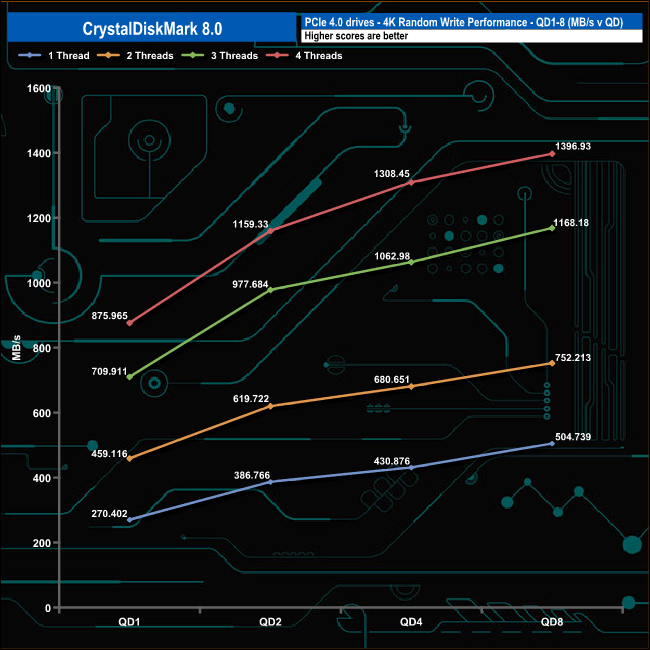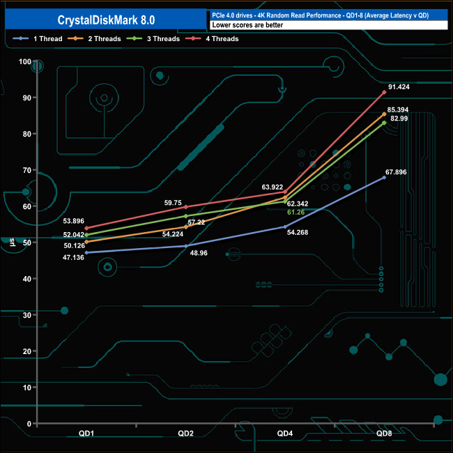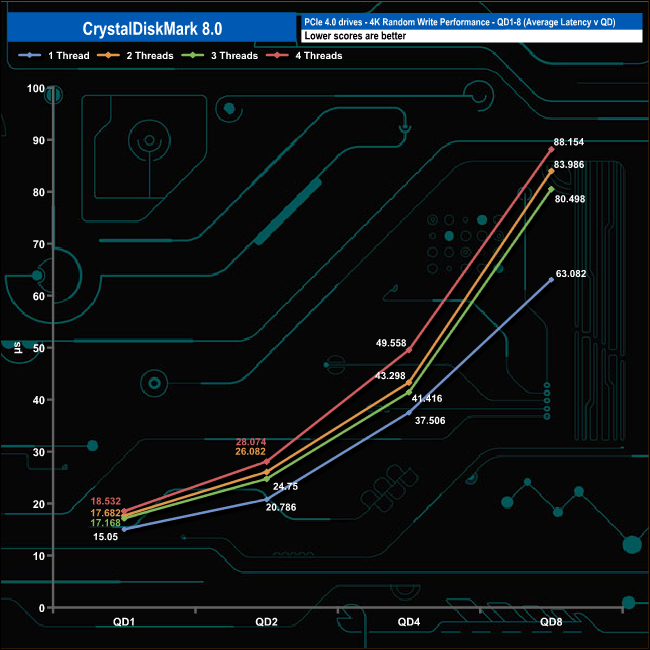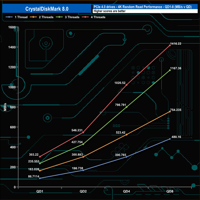 We used CrystalDiskMark 8 to test the random performance of the drive at lower queue depths (QD1 – QD8 where most of the everyday workloads occur) using 1 to 4 threads.