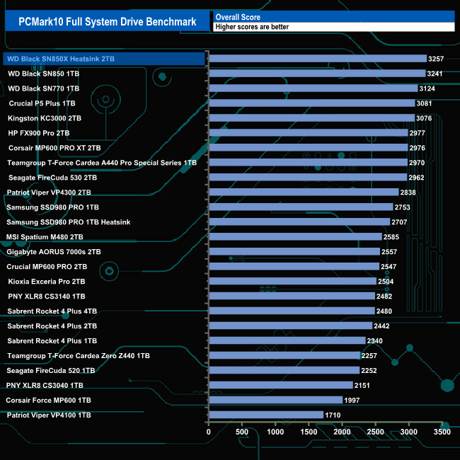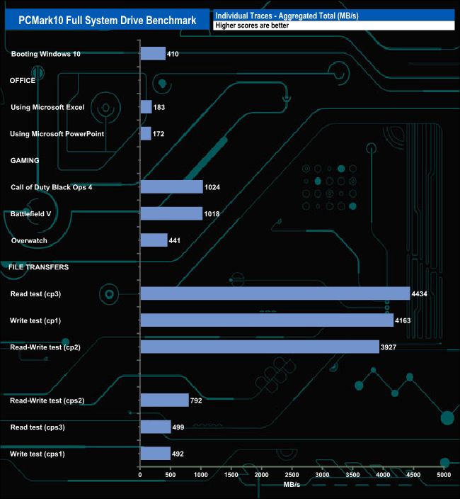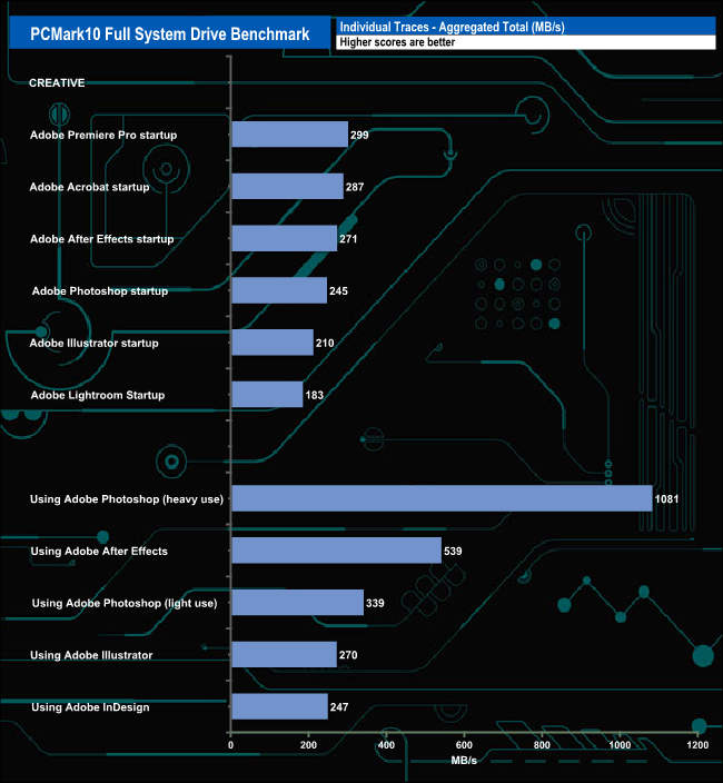 The PCMark 10 Full System Drive Benchmark uses a wide-ranging set of real-world traces from popular applications and common tasks to fully test the performance of the fastest modern drives. The benchmark is designed to measure the performance of fast system drives using the SATA bus at the low end and devices connected via PCI Express at the high end.