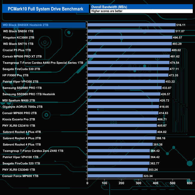 The overall bandwidth figure of 516.11MB/s sees the WD Black SN850X Heatsink just take over the top spot in the chart from the SN850, although there's not a lot in it.